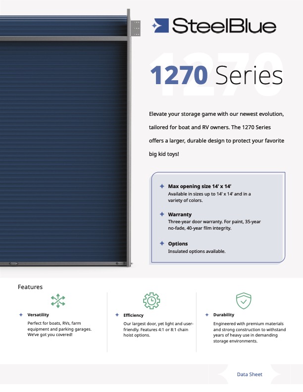 The 1270 Series roll up sheet door is designed for boat and RV storage facilities, marinas, and commercial buildings that need larger openings and heavy-duty performance. Combining reliable performance with smooth operation, these doors handle the size and usage demands that standard mini storage doors cannot meet. Each 1270 Series door features a dead axle configuration and guide system engineered for openings up to 14' wide, delivering the durability required for marine environments and high-cycle commercial applications. The result is dependable daily operation in facilities where door size, usage frequency, and environmental exposure exceed typical storage unit conditions.
